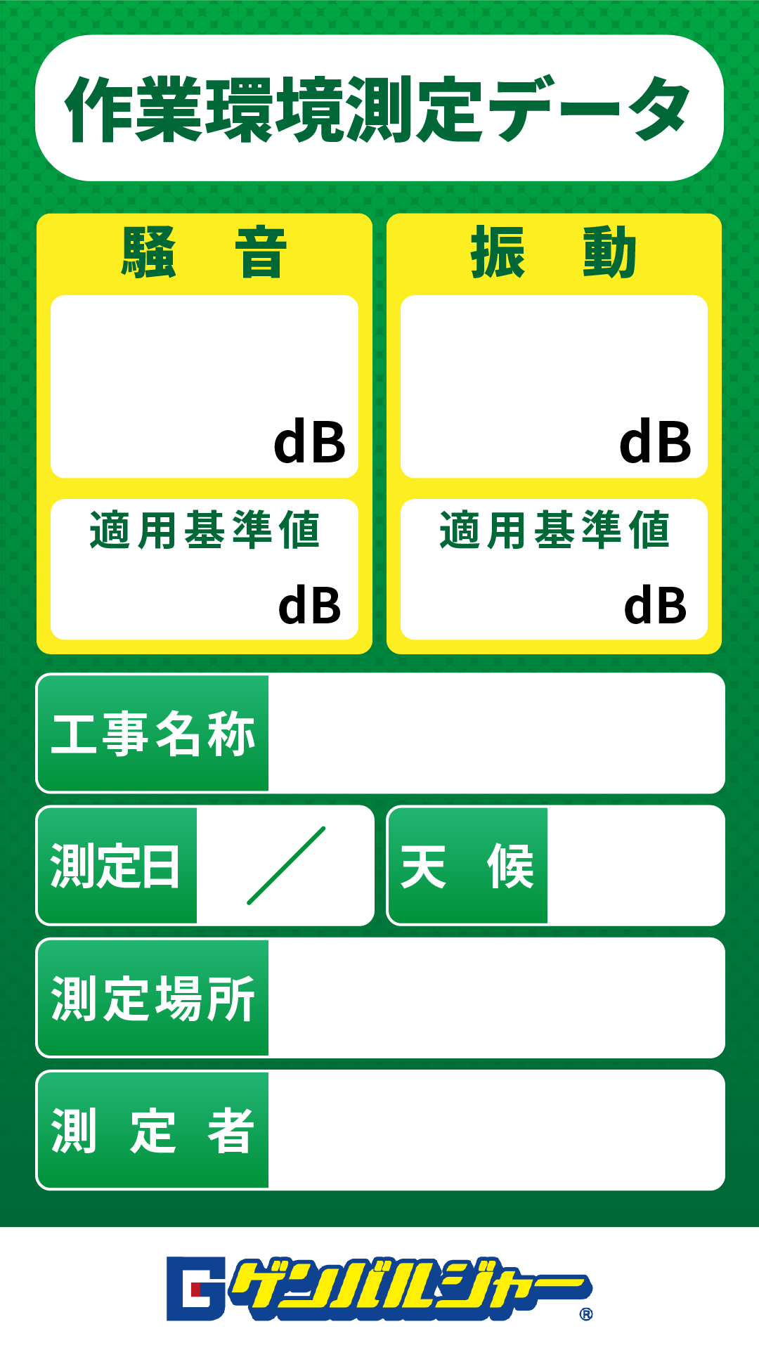 G10 騒音・振動測定 結果掲示(タテ) カテゴリー: 縦型ポスター 朝礼用デジタルサイネージ向けコンテンツ 汎用型コンテンツ 記入型テンプレート タグ: 安全活動 記録表 案内 「朝礼看板」向けのデジタルサイネージ用、「騒音・振動測定 結果掲示」のテンプレート画像です。 ※デジタルサイネージで画像が正常に表示されない場合は以下をお試し下さい。 ①ファイル名を半角英数字のみにしてください。 ②ファイル形式がjpgになっているか確認をしてください。 このコンテンツをダウンロード ロゴマークの除去またはオリジナルで作成