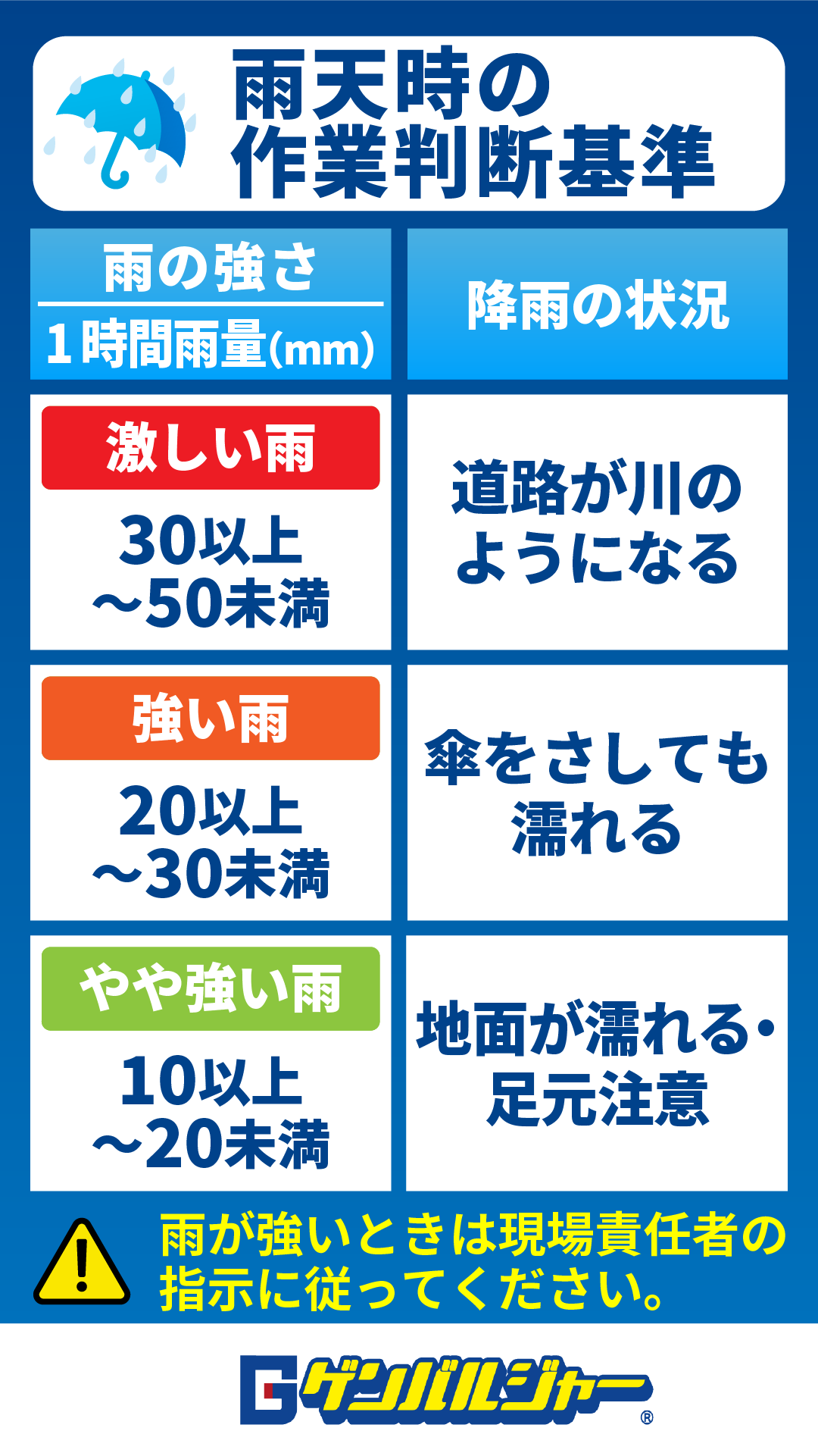 G28 雨天時 作業基準掲示(タテ) カテゴリー: 縦型ポスター 朝礼用デジタルサイネージ向けコンテンツ 汎用型コンテンツ タグ: 安全活動 案内 「朝礼看板」向けのデジタルサイネージ用、「雨天時 作業基準掲示」のコンテンツ画像です。 ※デジタルサイネージで画像が正常に表示されない場合は以下をお試し下さい。 ①ファイル名を半角英数字のみにしてください。 ②ファイル形式がjpgになっているか確認をしてください。 このコンテンツをダウンロード ロゴマークの除去またはオリジナルで作成
