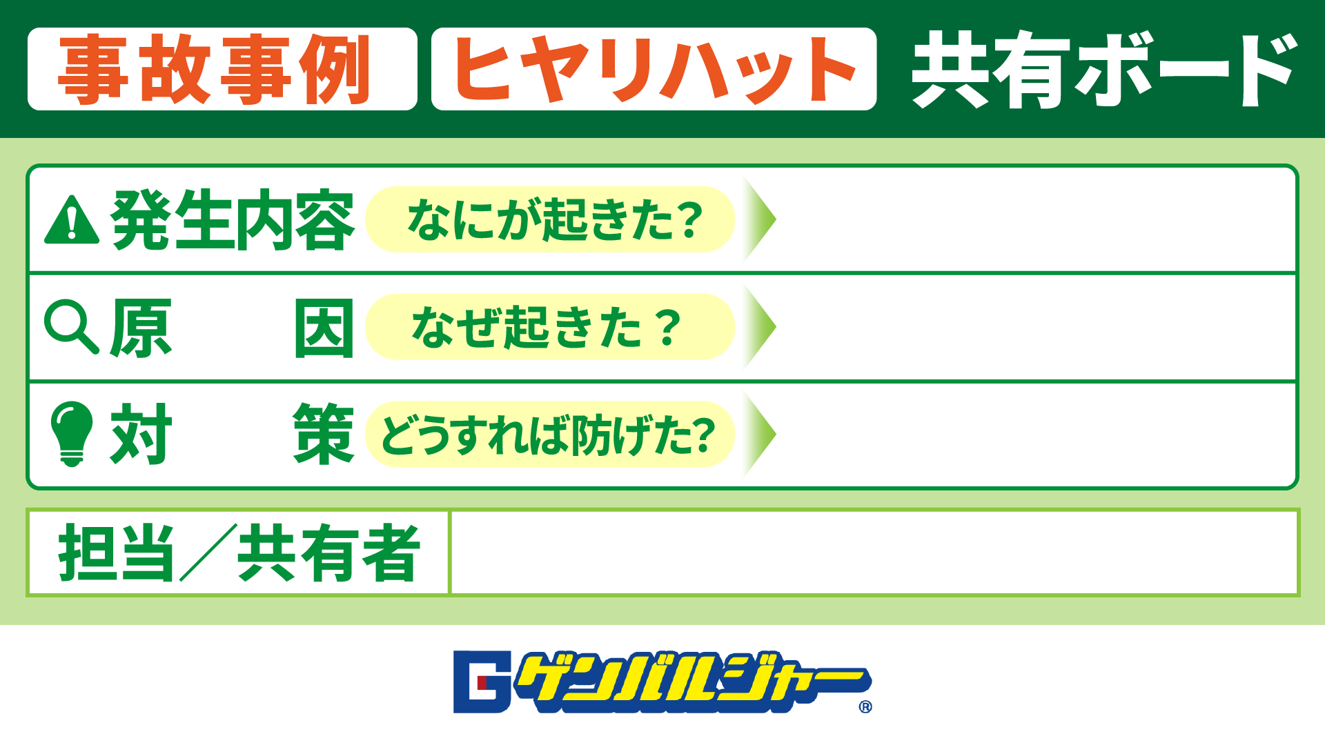G43 事故事例 共有ボード(ヨコ) カテゴリー: 横型ポスター 朝礼用デジタルサイネージ向けコンテンツ 汎用型コンテンツ タグ: 落下物 緊急 ルール 報告 安全活動 共有 墜落防止 対策 出火防止 原因 目標 事故 記録表 案内 点検 「朝礼看板」向けのデジタルサイネージ用、「事故事例 共有ボード」のコンテンツ画像です。 ※デジタルサイネージで画像が正常に表示されない場合は以下をお試し下さい。 ①ファイル名を半角英数字のみにしてください。 ②ファイル形式がjpgになっているか確認をしてください。 このコンテンツをダウンロード ロゴマークの除去またはオリジナルで作成