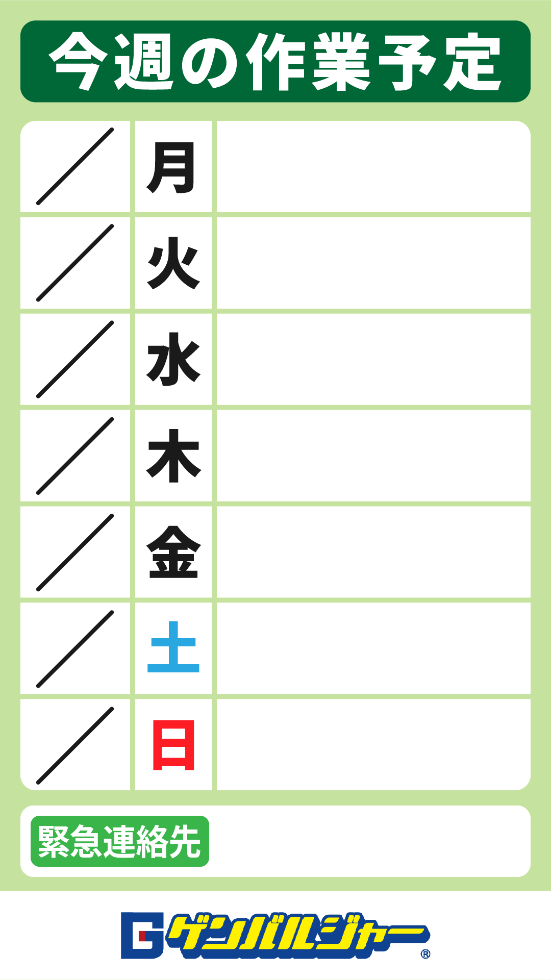 G8 週間工程表(タテ) カテゴリー: 縦型ポスター 朝礼用デジタルサイネージ向けコンテンツ 汎用型コンテンツ 記入型テンプレート タグ: 告知 予定表 案内 「朝礼看板」向けのデジタルサイネージ用、「週間工程表」のテンプレート画像です。 ※デジタルサイネージで画像が正常に表示されない場合は以下をお試し下さい。 ①ファイル名を半角英数字のみにしてください。 ②ファイル形式がjpgになっているか確認をしてください。 このコンテンツをダウンロード ロゴマークの除去またはオリジナルで作成